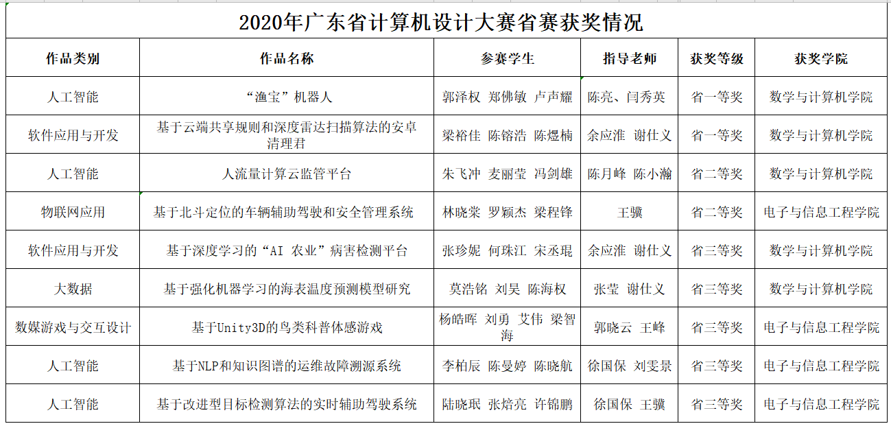 6月24日,由广东省教育厅主办的“2020年广东省大学生计算机设计大赛”落下帷幕。今年的比赛有来自广东省80多所本科院校共1129件作品参加。经过初评和复审两个环节,共评选出582件作品晋级省决赛。我校学子在比赛中不畏强手,奋力拼搏,最终获得广东省一等奖2项、二等奖2项、三等奖5项的好成绩。其中来自亚洲国产成人精品激情在线团队的《“渔宝”机器人》和《基于云端共享规则和深度雷达扫描算法的安卓清理君》两项作品勇夺省赛一等奖。