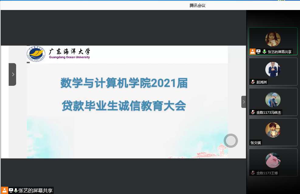 为帮助2021届贷款毕业生掌握还款流程和政策,加强贷款毕业生诚信教育,6月3日下午,我院通过腾讯会议平台召开2021届贷款毕业生诚信教育会议。会议由学院负责贷款专项工作的辅导员张艺老师主讲,学院2021级贷款的全体毕业生参加。