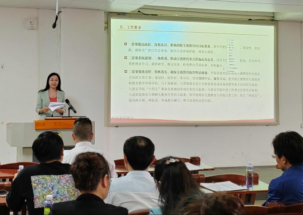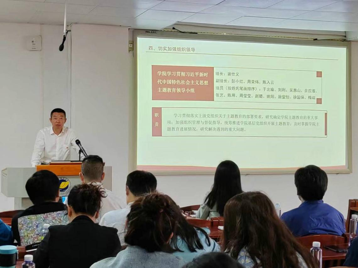 会上,谢仕义传达了学校主题教育动员部署会会议精神,阐述了此次主题教育的重大意义、目标要求、工作安排,对学院开展好主题教育作出了部署。他强调,开展好主题教育是当前学院党委的首要政治任务,院系两级党组织一定要谋划好、组织好、落实好,一是要提高站位、深化认识,准确把握主题教育的目标要求;二是要系统谋划、一体推进,推动主题教育重点措施走深走实;三是要强化责任、狠抓落实,确保主题教育取得明显成效,把开展主题教育与迎接本科教育教学审核评估、与落实学院“十四五”事业发展规划各项任务、与高质量落实立德树人根本任务结合起来,推动学院高质量发展。