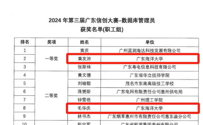 11月29日,第三届广东信创大赛——数据安全管理员职业技能竞赛、数据库管理员技能竞赛在广州举行,来自广东省各地的137家单位千余名选手参与角逐,涉及政府机关、企事业单位、高职院校及科研机构等。亚洲国产成人精品激情在线物联网工程系教师黄友沛、毛华庆发挥出色,最终获得数据库管理员技能竞赛(职工组)一等奖、二等奖的好成绩。