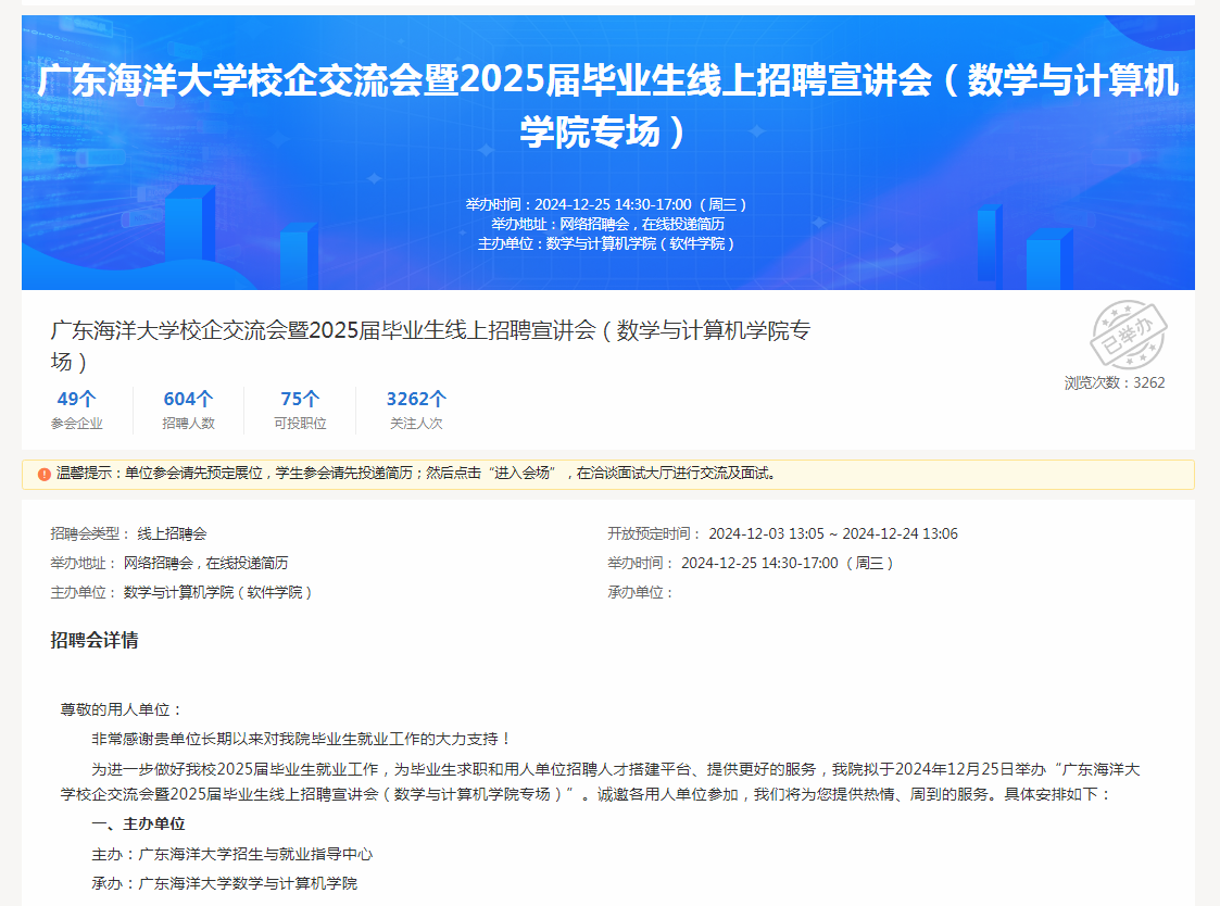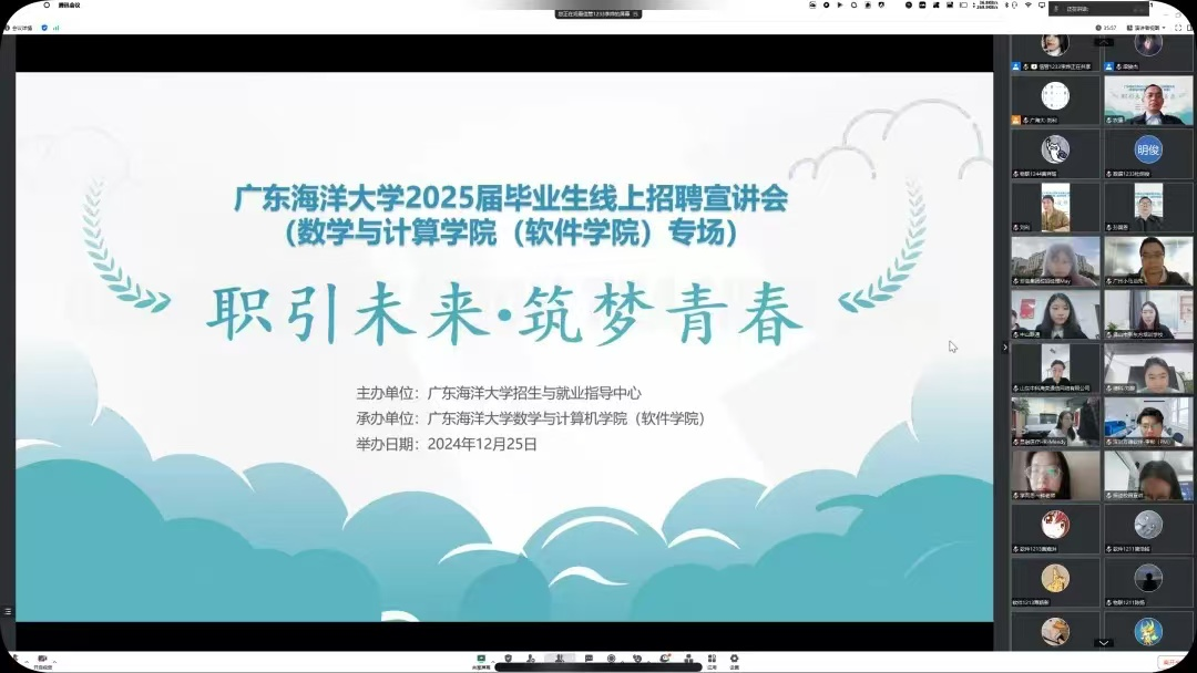 为全面落实党中央、国务院关于实施就业优先战略促进高质量充分就业的意见、广东省高校毕业生就业工作会议精神和学校就业工作要求,2024年12月25日,学院通过腾讯会议在线上成功举办广东海洋大学亚洲国产成人精品激情在线专场校企交流会暨2025届毕业生线上招聘宣讲会,会议由学院正处级辅导员、党委副书记农康主持,共计有十余家企业,二百余名学生参加。