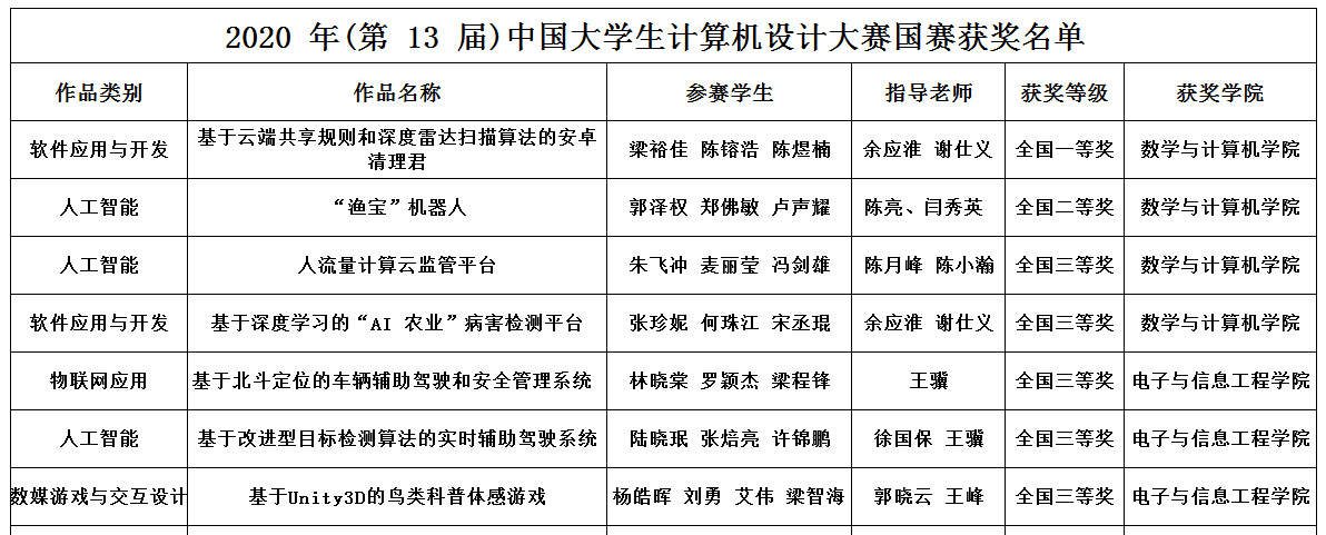 827日,2020年(第13届)全国计算机设计大赛评选结果揭晓,本次大赛有来自全国600余所高校,共有4646件作品进入国赛决赛,我校入选的7支队伍,以过硬的技能和优异表现,与双一流、985211大学等重点高校学生同台比拼,在激烈的竞争中荣获一等奖1项、二等奖1项、三等奖5项的好成绩,其中来自我院团队的作品《基于云端共享规则和深度雷达扫描算法的安卓清理君》勇夺全国一等奖,《“渔宝”机器人》获得全国二等奖。