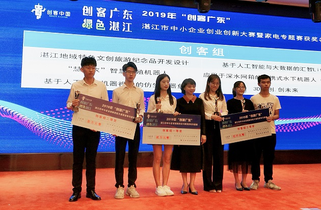 由广东省工信局、湛江市工信局主办的“创客广东”湛江市创业创新大赛从5月开始举办以来,来自湛江五县四区各高新企业,各高校创业团队的一百多个项目参与了角逐,经初审、复赛、决赛等层层选拔和激烈竞争,最终,我院汇智团队的“基于人工智能与大数据的汇智Life”项目、海创团队的“‘慧助农’智慧养殖机器人”项目通过层层考验,最终均获得创客组二等奖,奖金各壹万元; “应用于深水网箱的便携式球形水下机器人— 海宝”项目、 “蓝科企业—基于人工智能机器视觉的仿生机器鱼”项目获得三等奖。