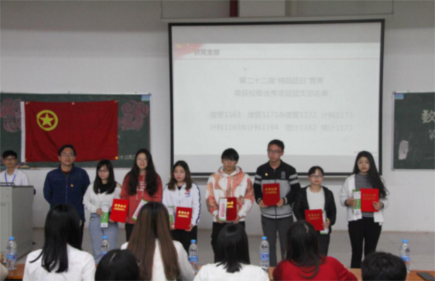 会议在雄壮的团歌声中拉开了序幕。会议首先为在学校第22届“精品团日”竞赛中荣获校级优秀项目的团支部颁奖,信管1171&1172联合团支部负责人温文烨为大家分享了开展团日活动的经验。