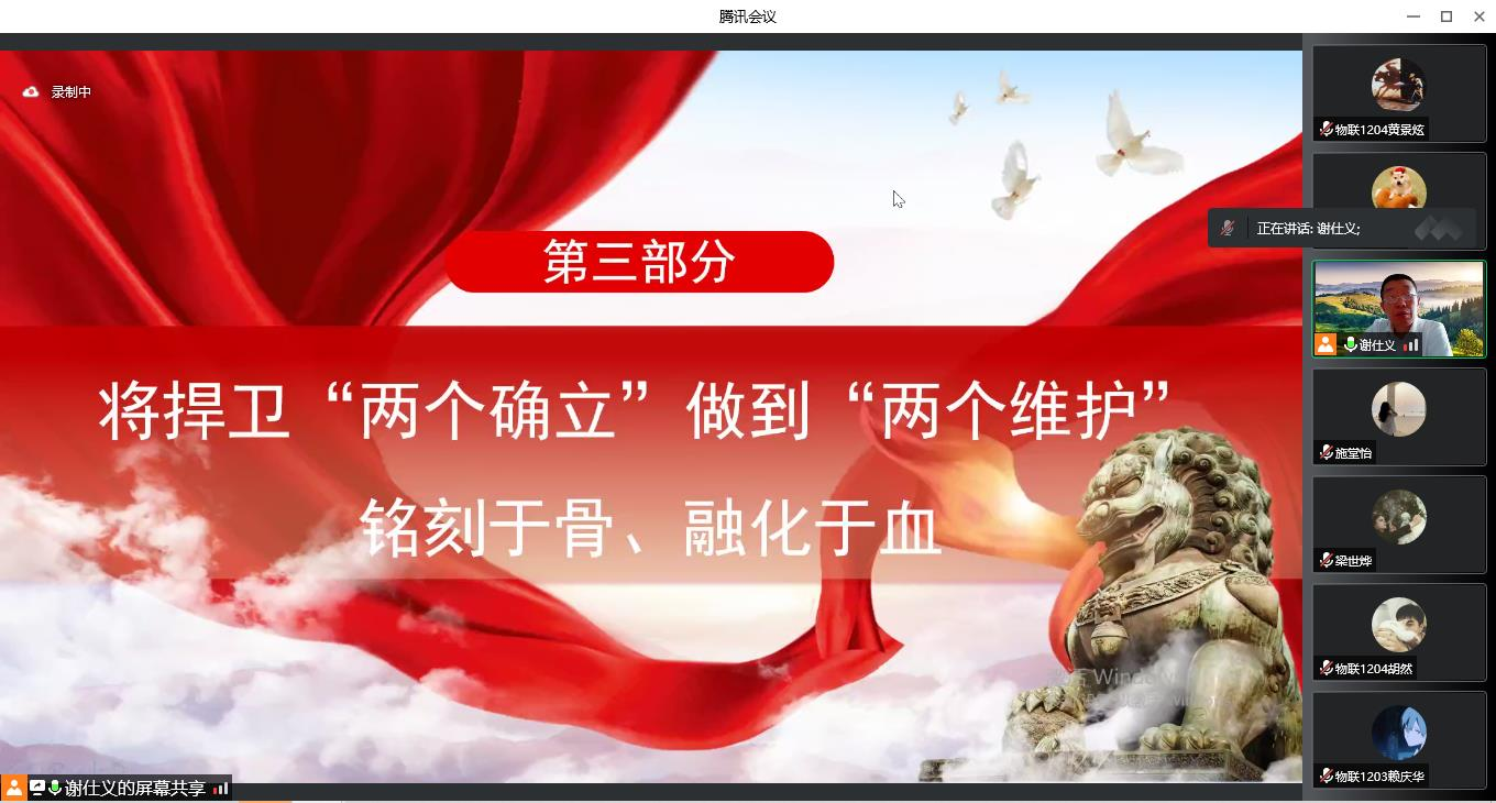 9月15日下午,学院党委书记谢仕义通过腾讯会议给物联1203、1204班的同学们讲授了题为“领悟两个确立,做到两个维护”的新学期“思政第一课”,带领同学们一同深入学习了《习近平谈治国理政》第四卷。